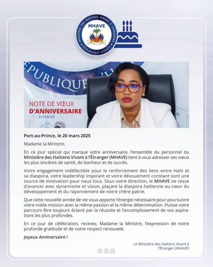 Le personnel du Ministère des Haïtiens Vivant à l’Étranger – MHAVE souhaite un joyeux anniversaire à la Ministre J.E Kathia Verdier qui fête son anniversaire ce jeudi 20 mars 2025.