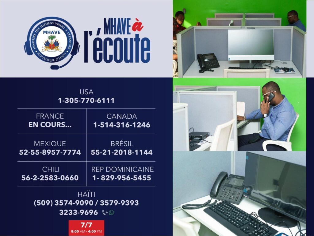 Ministè Ayisyen kap viv lòtbò yo (MHAVE) ap anonse tout moun sèvis ” MHAVE à l’Écoute ” la ap mache kòmsadwa pou pran doleyans tout frè n ak sè n ki nan Dyaspora. Apati jodi a tout liy telefòn sèvis la disponib pou resevwa apèl ki sòti nan Dyaspora. Objektif : Fasilite swivi dosye nou yo devan enstitisyon leta Ayisyen yo epi garanti yon bon jan sipò rapid ak efikas. Konpoze nimewo sa yo : USA : 1-305-770-6111 Kanada : 1-514-316-1246 Brezil : 55-21-2018-1144 Repiblik Dominikèn : 1-829-956-5455 Chili : 56-2-2583-0660 Mexique : 52-55-8957-7774 Ayiti : (509)4289-8888 / 3270-8888/ 3574-9090 / 3579-9393 (+509) 3233-9696 (WhatsApp disponib ) Orè sèvis : 7 jou sou 7, de 8h00 AM a 4h00 PM. Nou la pou nou sipòte w ! Nou pran tout pwoblèm ou yo oserye epi nou angaje nou pou nou ba w bon jan asistans. MHAVE, toujou pi pre dyaspora li !